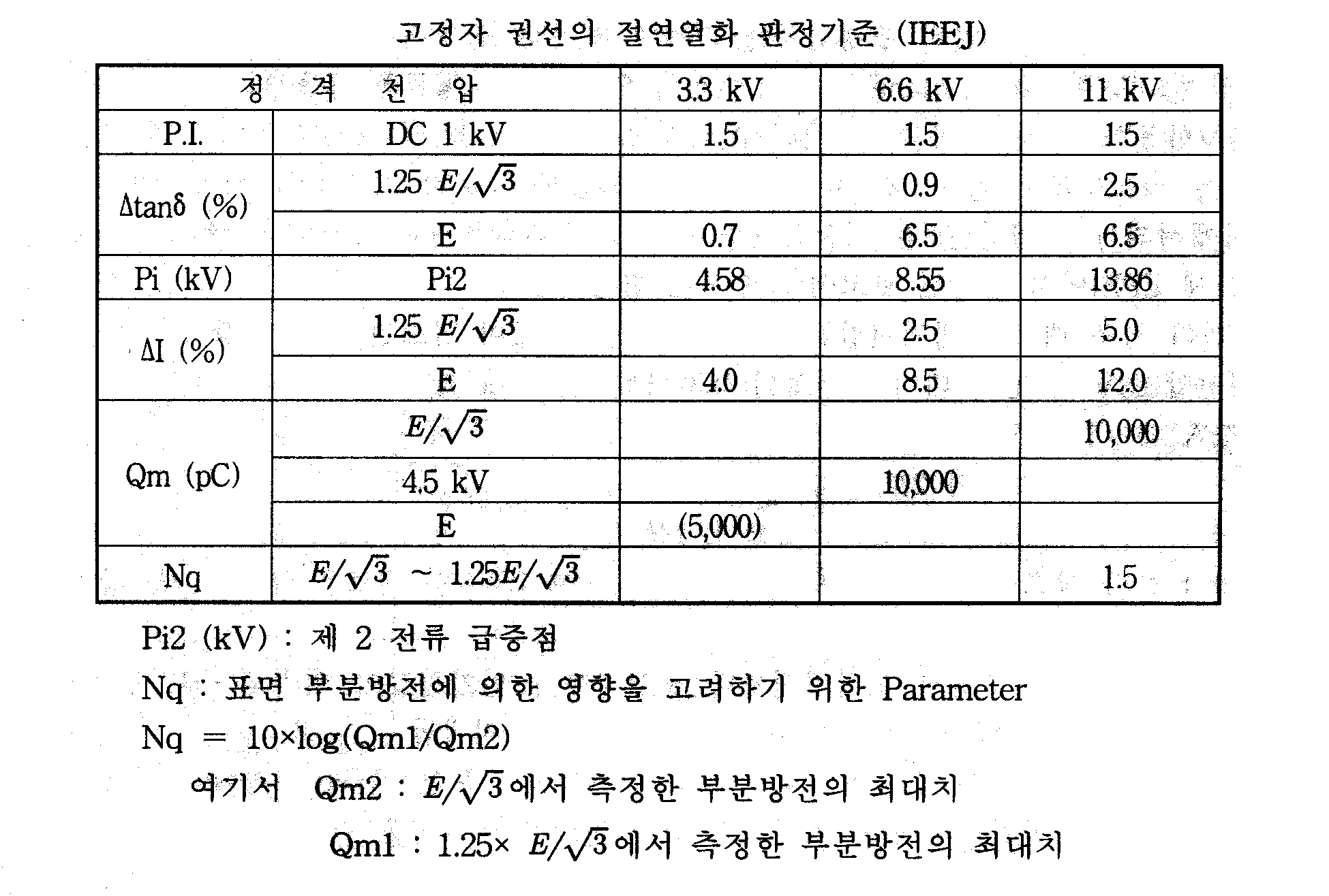 발전기, 전동기 등 절연물을 열화를 평가하기 위한 시험으로 유전정접시험, 교류전류시험, 부분방전시험 시험을 하는데, 시험결과 이 전기기기의 양호여부를 판정하기 위한 기준으로 IEEJ기준으로 약간 old한 느낌은 있지만, 크게 문제는 없을 내용이다. 유전정접시험은 절연물 전체의 절연열화 상태를 확인하는 시험이며, 교류전류시험은 전류 급증현상을 찾아내어 열화를 판정하며, 부분방전시험은 절연물중 가장 큰 결함의 방전펄스 값을 알아내는 시험이다. 그러나 이 시험 한가지로 전기기기가 열화되었다고 판정하기는 어려우며, 과거 데이터와 제작사등 여러가지를 고려하여 판정을 해야하므로, 어느정도 경험과 노하우가 필요합니다.