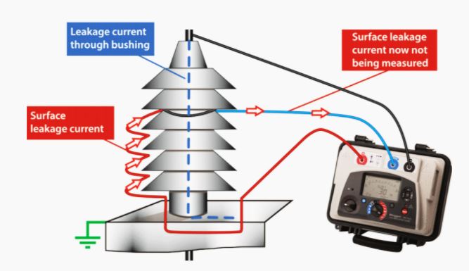 그려면 변압기 A상에서 메가 시험을 한후, 절연저항값이 기준치 이하인 경우, 애자인지 권선인지 구분을 하고자 한다면 어떻게 해야 할까요? 이때 사용할 수 있는 옵션이 메가 측정기에서 가드(Guard)입니다. 아래 그림에서 부싱에 검정색으로 표시된 것이 Guard ring(가드 링)이라고 하는데, 이 링이 부싱을 통해 누설되는 전류를 측정하게 되는데, 이 단자에서 오는 신호를 메가의 G단자에 연결하면 이 부싱을 통해 흐르는 누설전류를 무시하는 시험이 됩니다. 이는 변압기 공장검사 정도에서 확인하는 시험이지만, 용도를 확장하면 현장에서 애자와 권선을 분리하는 용도도 될 수 있습니다.