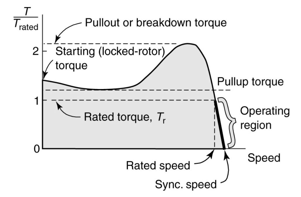- 기동 토크(Starting Torque) : 고정자권선의 정격전압, 주파수에서 전동기의 회전자가 회전하기 위해 발생하는 토크 즉 필요한 회전력(요구되는 회전력)을 말합니다. 이는 자전거를 탈 때 처음 자전거가 굴려가기 위해, 페달을 발로 힘껏 밟아줘야 바퀴가 회전하듯, 바퀴 회전을 위해 필요한(전동기 회전자 회전을 위해 필요한) 힘을 말합니다. 여기서 기억해야 할 일은 전동기를 구매할 때, 기동토크(회전력)가 얼마나 필요한지는, 전동기가 부담해야 하는 부하의 특성이 팬 또는 펌프인지에 따라서 NEMA 규격에 맞춰 필요한 토크를 갖춘 전동기를 구매를 해야 합니다.
