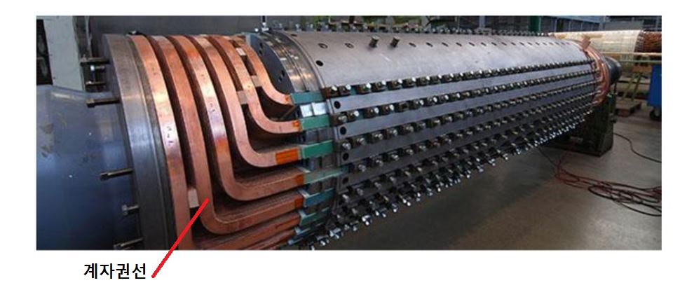발전기 회전자는 여자기에서 공급되는 직류에 의해서 자속을 만들어 공극을 지나 전기자권선과 쇄교할 정도로 큰 에너지를 가지고 있다. 발전기 설계사는 회전자 길이와 권선량, 공극등을 Tradeoff로 해서 원하는 용량을 설계하게 된다. 근본적으로 회전자는 많은 권선으로 되어 있어서, 대규모 인덕터로 간주하면 되며, 아래 사진은 대용량 계자권선을 볼 수 있는 발전기입니다.