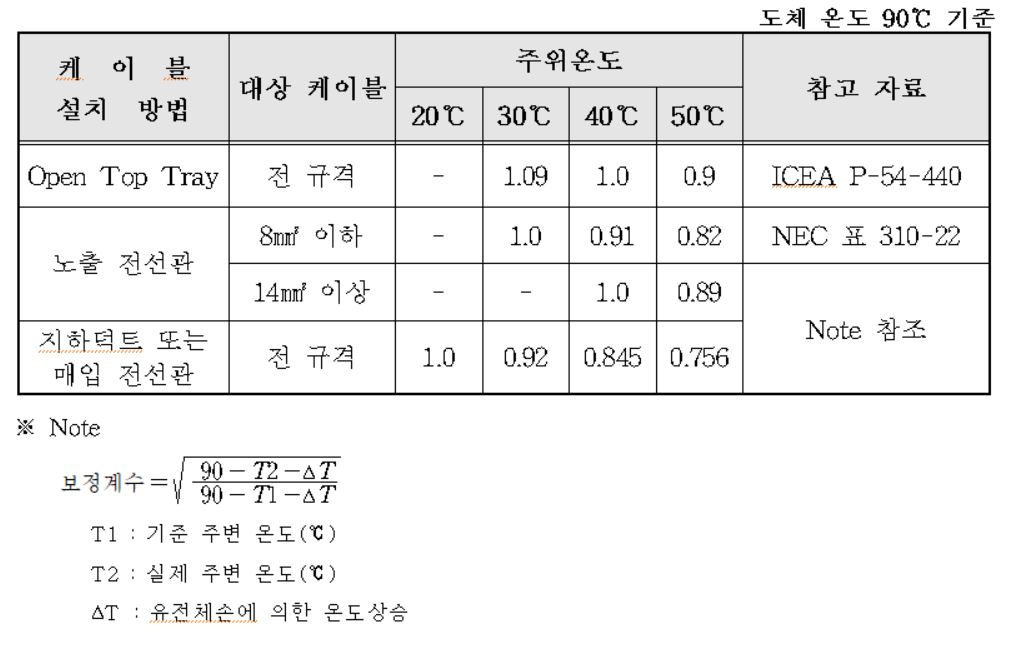 케이블의 전류 용량은 아래의 조건들에 의해 영향을 받으므로 각 케이블 설치 상태에 따라, 주위온도와 도체온도에 따른 보정계수에 의하여 보정을 하여야 합니다.