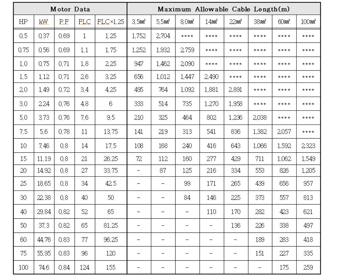 - 전압강하 허용은 전부하 운전시, 480V 전동기 및 인입 케이블은 정격 전압의 3%, 기동시 480V MCC 전동기용 케이블은 정격전압의 12%로 한다.