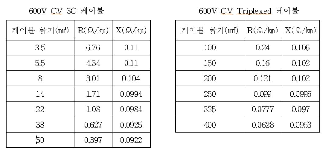 - 케이블 선로정수(R, X)는 아래의 케이블 선로정수를 적용한다.