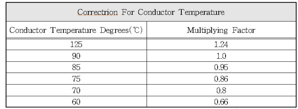 - 도체 온도 90℃, 주위온도 20℃ 기준임