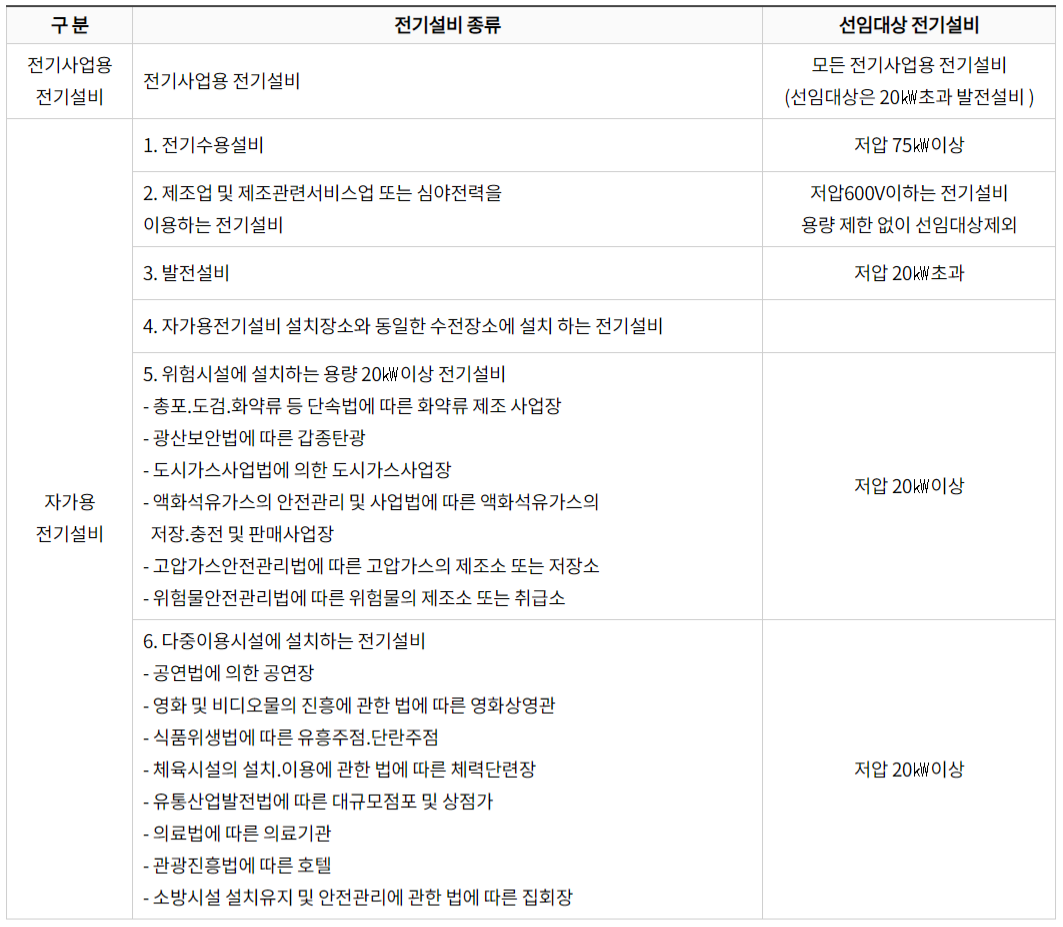 ■ 전기안전관리자 선임대상 전기설비는 아래의 전기사업법 시행규칙에 해당하는 설비이다.