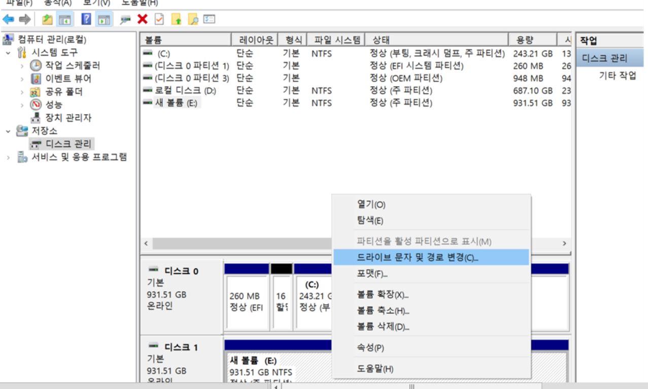왼쪽 메뉴에서 저장소에서 디스크 관리를 클릭한 후