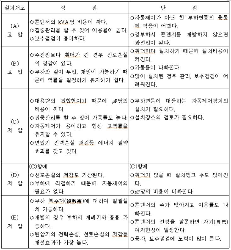 콘덴서 설치에 따른 효과는 배전선을 포함한 설비에 나타나므로 각각의 부하에 개별적으로 설치하는 위의 (다)방식이 가장 효과가 크다. 그러나 이 경우 부하의 수가 많으면 그것에 대응해서 소용량, 다량의 콘덴서가 필요하게 되어 설비비가 많이 든다. 또한 부하가 정지하면 콘덴서가 이용되지 않게 되어 이용률이 낮아지는 등의 결점이 있다. 위의 (나)방식은 변압기의 손실절감과 여력이 증가되며, 콘덴서를 제어하기 쉽고 이용률도 비교적 높은 반면 저압용 콘덴서이기 때문에 가격이 비싸다.