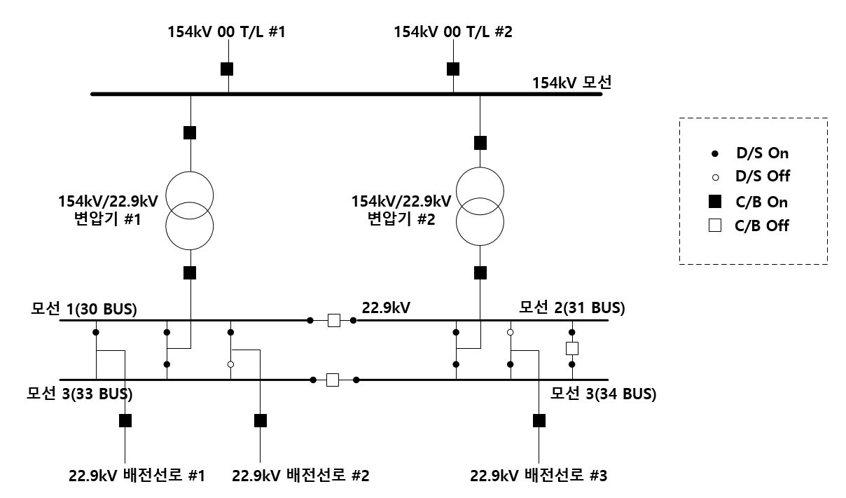 단모선 방식은(Single Bus) 보시는 것처럼 차단기 고장으로 전체가 정전이 되는 불안전한 설비방식이며, 건설비가 적게 드는 편이고요, 따라서 대체 전원이 있거나 중요하지 않는 곳에 전력을 공급할 때 쓰는 방식인데요. 요즘은 거의 전력기기들이 안정적이어서 단모선방식을 사용해도 큰 문제는 없습니다. 표준 2중모선 방식(1차단기 방식, Double Bus Single Breaker)은 건설비는 많이 들지만 기기 점검 및 계통 운용상 유리합니다.