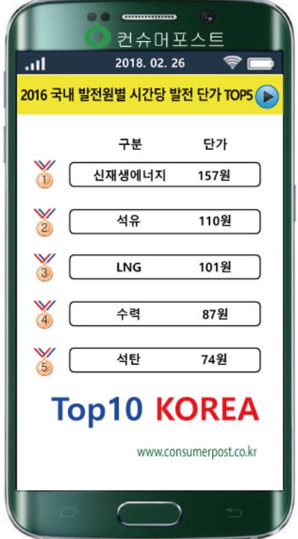 2016년도 국내 발전원별 시간당 발전단가(출처 :컨슈퍼 포스트)