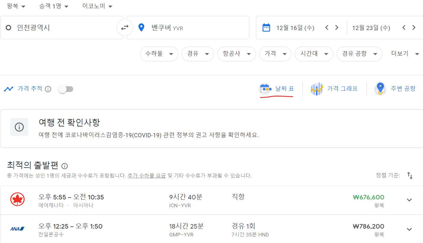 그럼 구글항공권으로(www.google.com/flights) 검색해봤습니다.