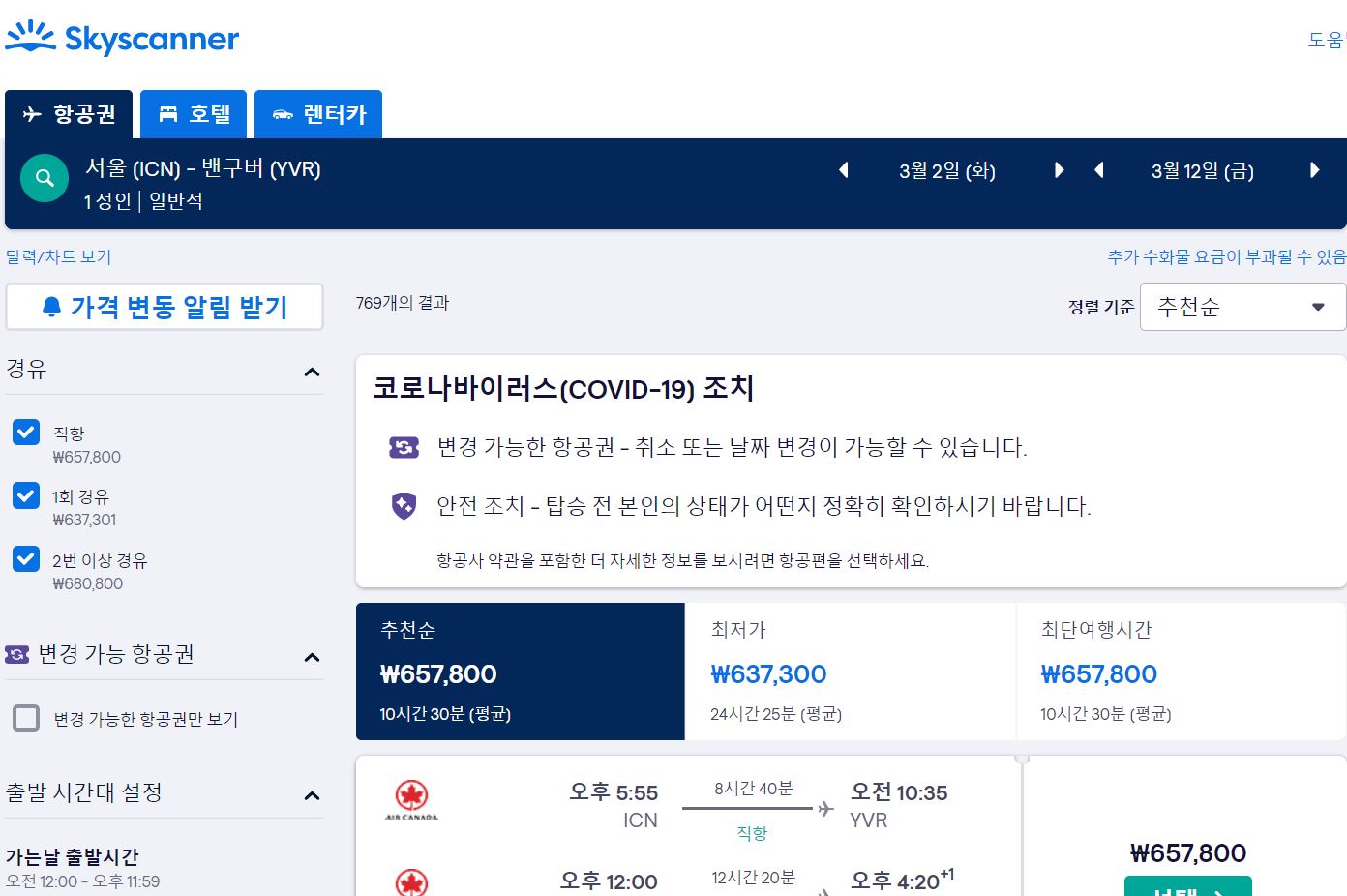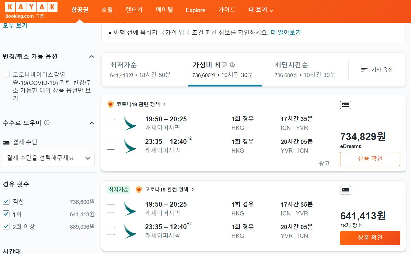 먼저 가격에서 보면 직항기준으로 네이버 74만원, 트립79만원, 스카이스캐너 65만원, 카약73만원, 익스피디아 83만원으로 스카이스캐너가 제일 저렴하게 나옵니다.