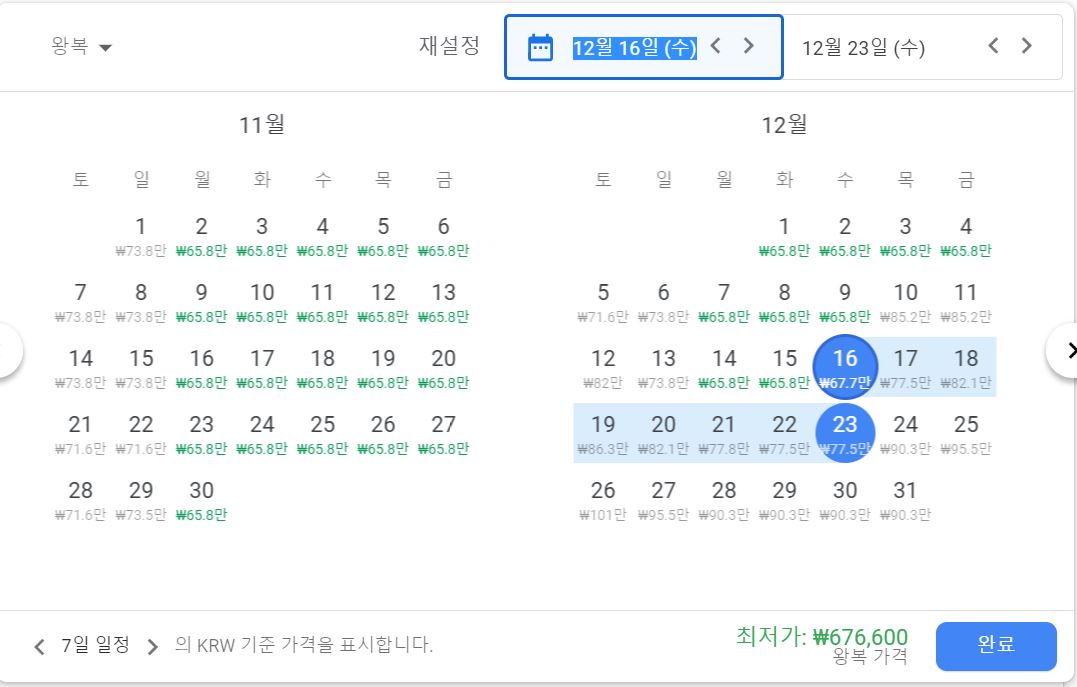 날짜별 요금을 보니 금요일, 토요일, 일요일은 가격이 비싸군요. 반면 월,화, 수, 목이 저렴한 편이군요. 날짜를 이동해가면서 가장 저렴한 것을 선택할 수 있겠네요. 이 놈의 구글은 도대체 못하는 것이 뭔지