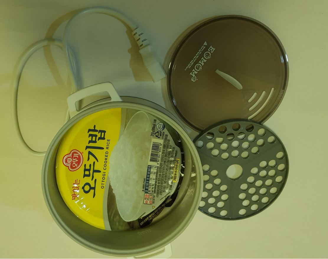 마지막 사진은 넓이를 보실수 있는데, 햇반을 넣을 수 있는 넓이입니다. 그리고 부속품도 같이 있네요. 전기로 요리를 하기때문에 일반 가스에서 하실때보다는 짧은 시간에 요리가 끝납니다. 바닥이외에는 플라스틱으로 보이는데, 규사(모래)로 만들어서 환경호르몬은 나오지 않는다고 합니다(검증이 필요함). 라면을 하나 구하면 사진을 추가해보도록 하겠습니다.