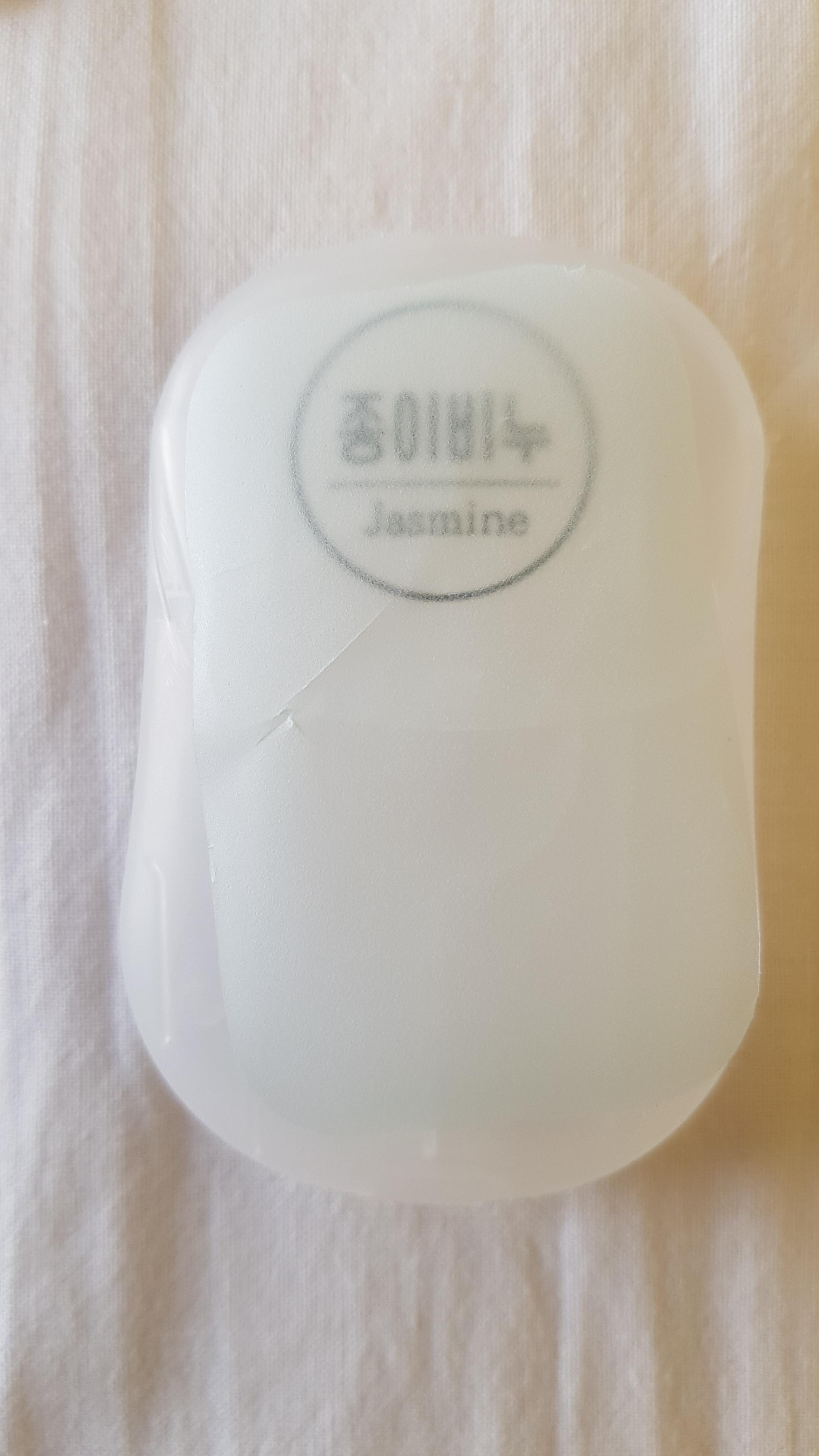 한묶음이 10개씩 들어 있습니다. 종이보다 더 얇아 보이는 두께이고요, 향은 쟈스민 향이 나는데, 냄새는 별로입니다. 그리고 한장으로 손을 씻기에는 충분합니다.