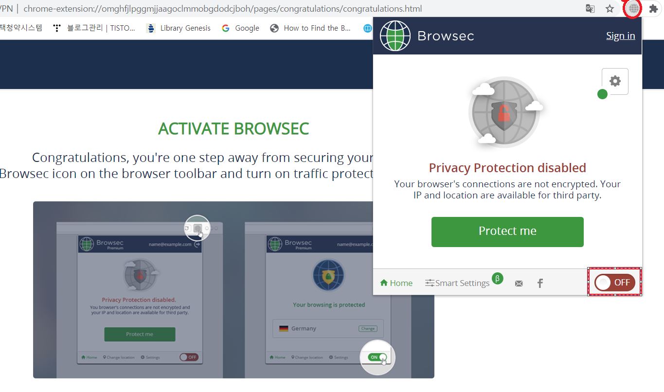 그리고 크롬 오른쪽 상단에 보시면, Browsec VPN이 보이시는데, 핀셋처럼 보이시는 것을 클릭하시면