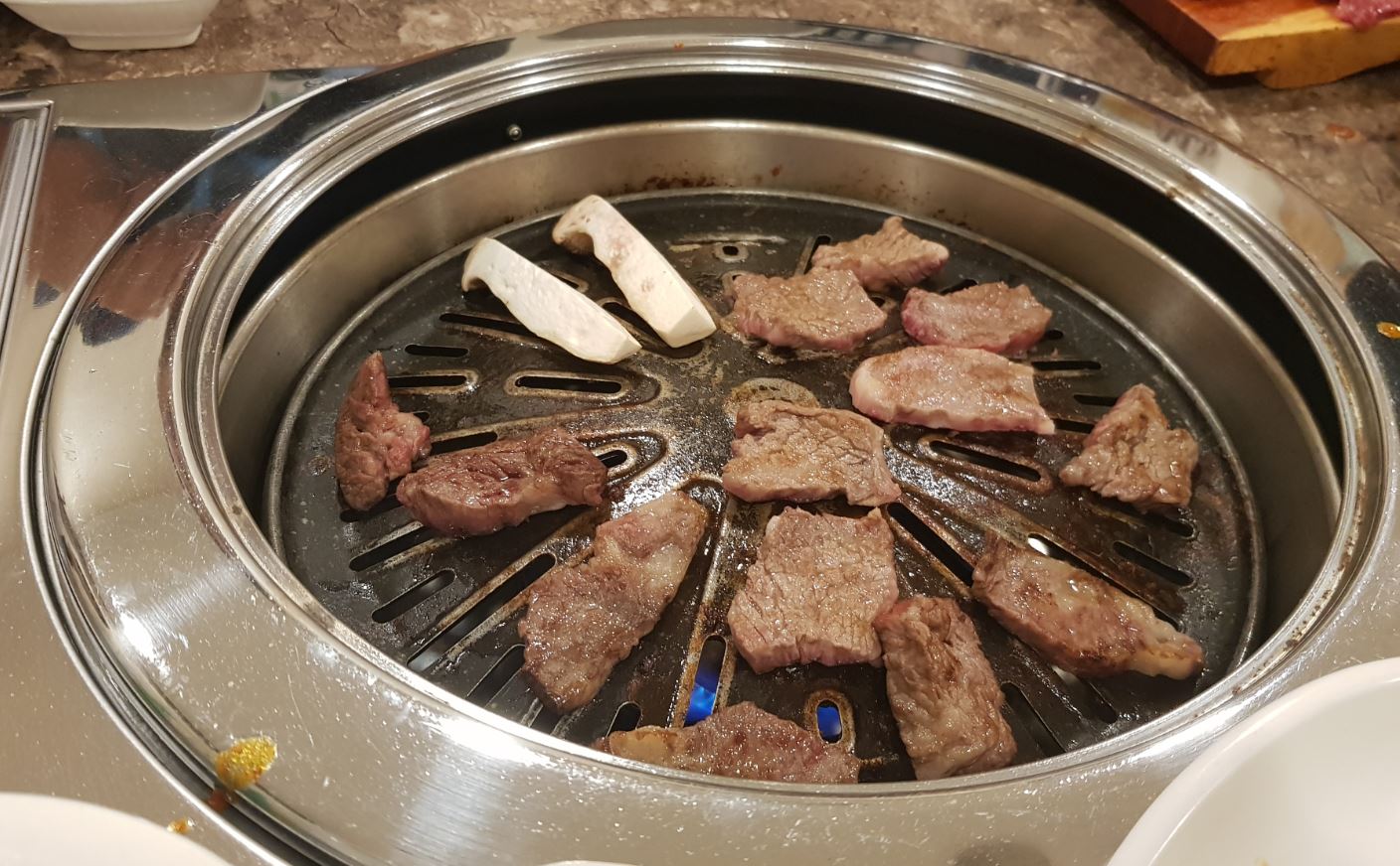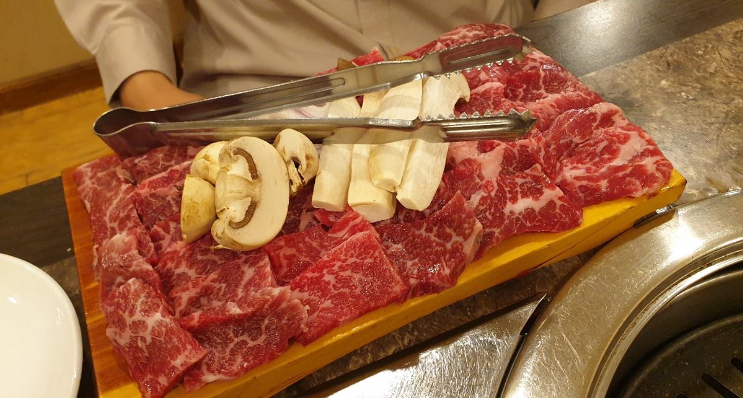 이 소고기들이 따뜻한 철판에 누우니, 벌써 색깔이 이렇게 변하는 군요. 완전 살살 녹는 느낌은 아니지만, 외국에서 꽤 한국의 맛과 유사한 느낌입니다.