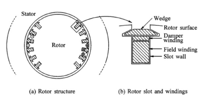 동기발전기에 보이지 않는 역할이 하나 있는데, 댐퍼권선(damper windIng)이라는 마치 유도전동기 회전자처럼 양쪽이 단락되어 있는 구조로 되어있습니다. 윗쪽 사진에서 보시면 회색에 구멍이 뚫린 것을 볼 수 있는데, 이것이 웻지인데, 아래 그림에서 보시는 것처럼 웻지 밑에 댐퍼권선이 있는 경우가 있고요. 또 다른 방식은 회전자 몸체와 웻지가 댐퍼권선 역할을 하기도 합니다. 보통 후자 방식이 더 많이 쓰이고 있습니다.