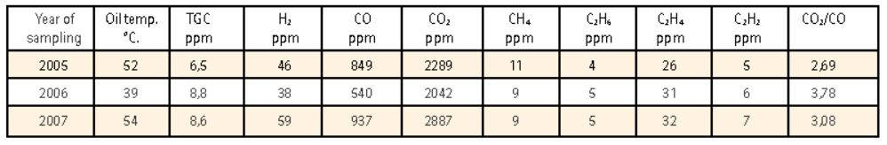 위의 표와 같은 결과가 나온 경우, IEC Code에서는 이를 분석하기 위해, 기본적으로 CO2/CO비를 검토하라고 권고하고 있으며, 비율이 3-11범위이면 정상적인 건전한 변압기로 해석을 하고 있습니다. 그러나 위에 표에서 보시면 2.69비인 2005년 생산된 변압기는 IEC 60599기준에 의하면 " 과도한 종이 열화가 의심된다면(CO2/CO ratio<3) 퓨란 화합물 분석 또는 종이 시료의 중합도 측정을 요구하는 것이 바람직하다"라고에 해당됩니다. 그러나 여기서 관심가져야 하는 상황은 다른 가스들의 상태입니다. 다른 가스들의 상태가 크게 변화없다면, 그리고 극소량이면 굳이 퓨란분석을 할 필요는 없습니다. 그리고 또한 절연유중에 수분등이 많이 검출되지 않으면 필터링을 하면 안되고 주기적으로 관찰을 해야합니다. 기타 더 궁금하시면 댓글로 문의하시면 무료로 답변을 해드리겠습니다. 제가 회사 업무에 지칠 경우만 제외하고요.