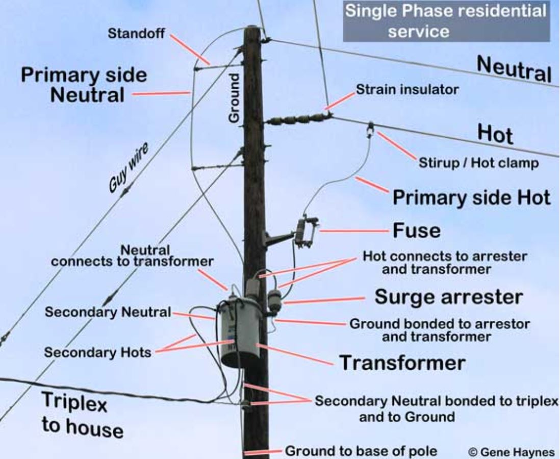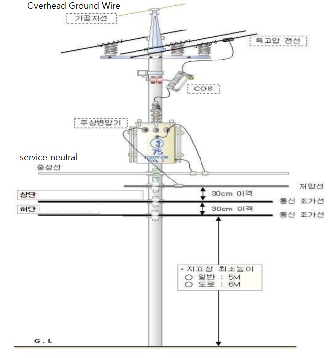 먼저 아래 그림에서 제일 상부에 위치한 가공지선(Overhead Ground wire)는 일반적으로 낙뇌직격시의 사고방지, 유도뇌 및 근접 낙뢰시에 선로 전체, 지지물등에 의하여 발생하는 코로나 억제의 능력이 있는 배전선의 효과적인 내뢰시설입니다. 이 가공지선과 중성선은 같이 연결되지 않아, 낙뢰시에 중성선의 전위가 상승하는 것을 방지합니다.