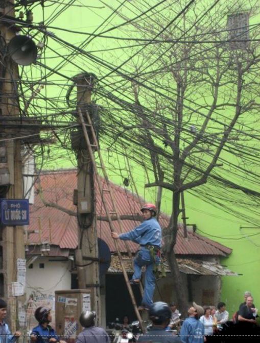 아래 사진은 중국의 전봇대에 붙어 있는 어지러운 각종 통신선 및 전선들입니다. 그리고 전봇대 위에 혹시 까치집을 발견하시면 한전(123)으로 전화주셔서 정전이 되지 않았으면 합니다.