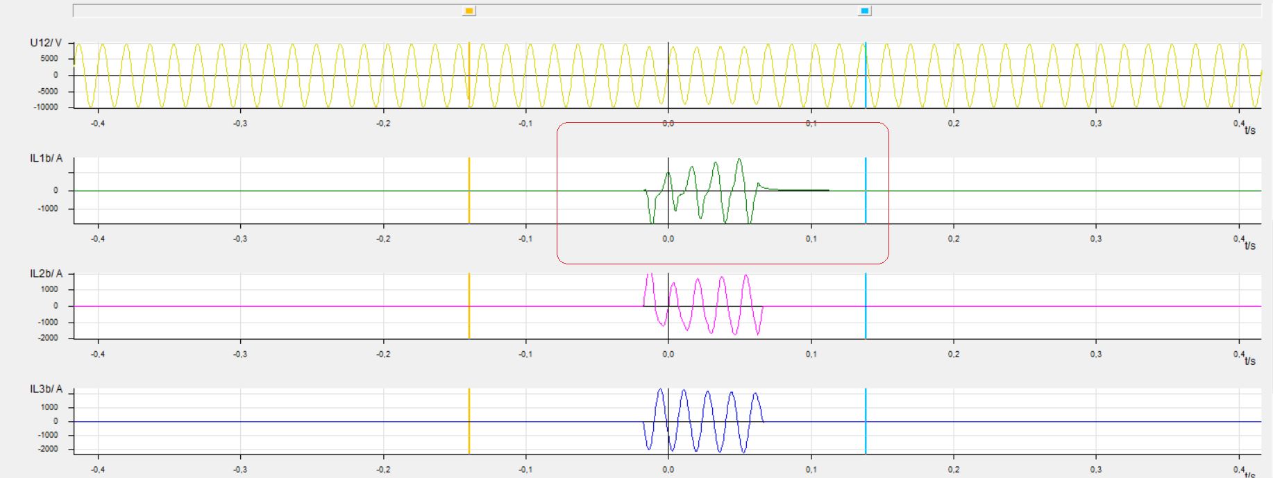 여기서 중요한 입력요소는 계기용변류기에서 오는 두 전류인데(Current Transformer), 이 CT에 문제가 있는 경우에 전동기 문제가 없는 경우도 동작하는데, 그 사례를 한번 소개해드립니다. 대형전동기인데 기동중에 트립이 되었는데, 전동기 손상으로 판단하고 절연저항, PI등을 체크하였는데 모두 정상으로 나왔습니다. 그래서 보호계전기에서 고장파형을 다운로드한 것을, Transview로 본 고장파형인데요, A상 파형이 찌그려져 있는 것을 볼 수 있습니다.